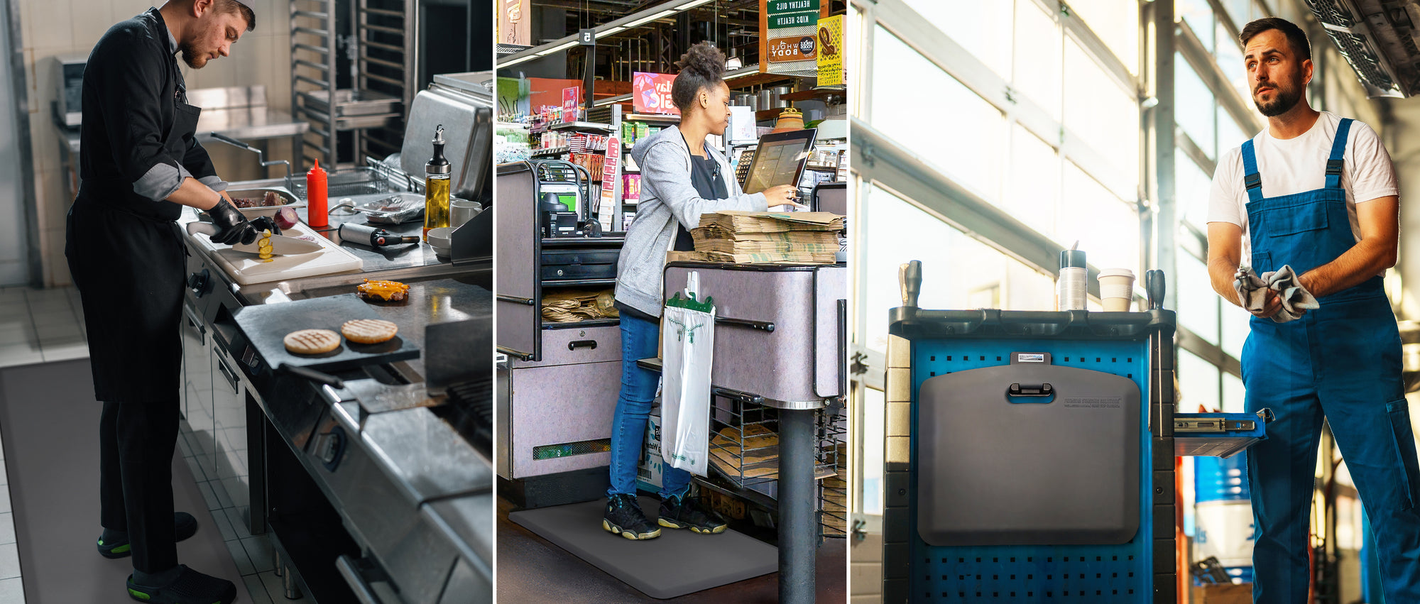 These mats are best placed at checkout stations, service counters, reception desks, showroom floors, and any location where employees stand for extended periods.